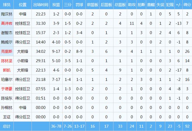 数据方面,山东队只有3名球员得分上双。其中,克里斯26分9篮板4助攻,得分全队最高;珀塞尔得到16分;陈林坚三分球5投3中,贡献14分。北控则有6人得分上双,其中里勒砍下全场最高的36分,外加7助攻3篮板3抢断。