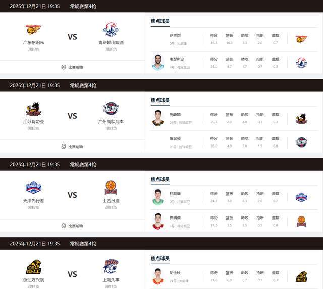 重头戏还是在12月21日晚上,广东男篮坐镇主场迎战青岛男篮,两支开局3连胜的球队遭遇了,杜锋PK刘维伟,看谁能拿到4连胜吧。另一场焦点大战则是卫冕冠军广厦男篮坐镇主场迎战上海男篮,这也是一场强强对话,两队前3轮都是2胜1负。