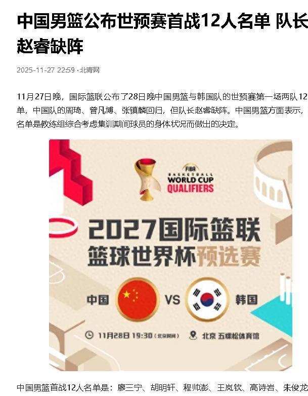 11月28日,中国男篮对阵老冤家韩国男篮的比赛马上就要开打,可就在赛前技术会公布的12人名单里,居然没看到赵睿的名字。