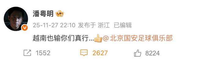 知名演员、北京本土球迷潘粤明在社交媒体上表达了自己的愤怒,他写道:越南也输,你们真行……并且at了北京国安足球俱乐部。