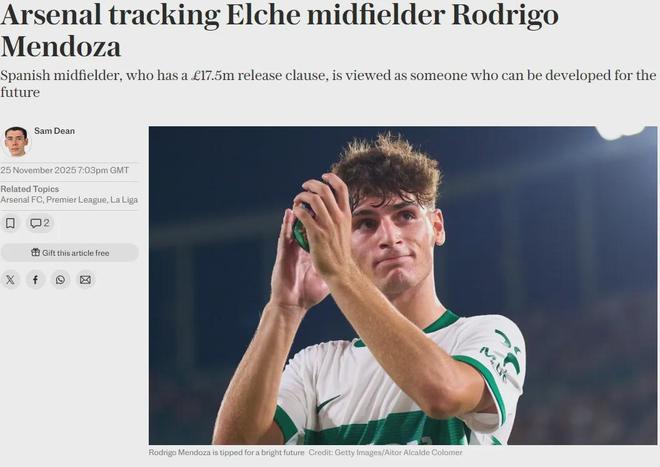 门多萨本赛季在埃尔切的表现让人印象深刻,电讯报了解到阿森纳的招募团队正在关注这名新星,他的合同中有2000万欧元的违约金条款(1750万英镑),不过报道同时指出,枪手在西班牙人的交易中还面临激烈的竞争,皇马也长期以来都十分欣赏门多萨,这名中场的风格经常被拿来对比巴萨的佩德里。