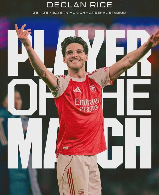 官方:赖斯被阿森纳票选为了全场比赛最佳球员!