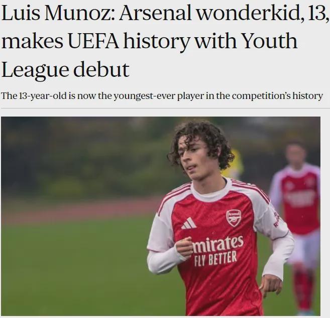 伦敦晚旗报消息,阿森纳小将路易斯-穆尼奥斯成为了青年欧冠历史上最年轻的出场球员,这名年仅13岁的神童(下个月才14岁)在枪手u19对阵拜仁的比赛中替补登场,创造了历史,最终阿森纳青年队4-2取胜。