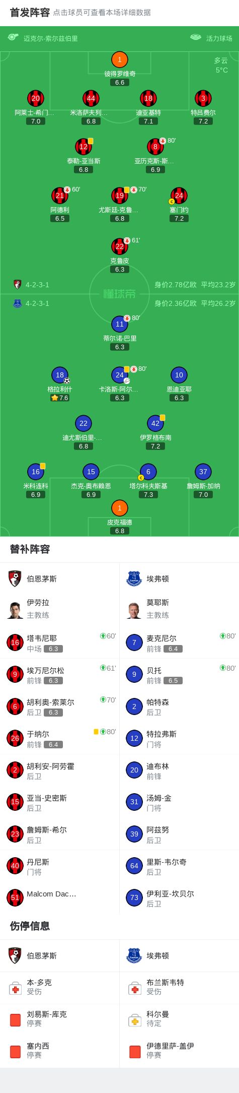 埃弗顿1-0客胜伯恩茅斯,格拉利什建功,克鲁皮破门被吹